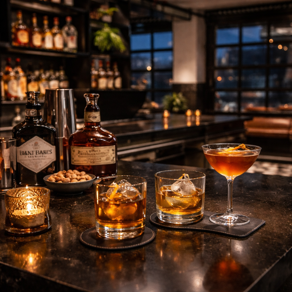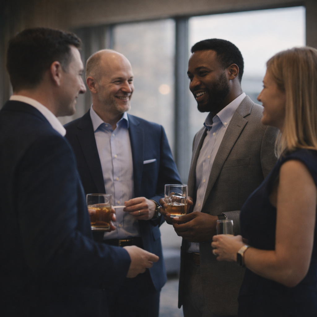 An upscale, ticket-only business networking experience featuring curated connections, a refined atmosphere, and complimentary tastings from select distilleries.